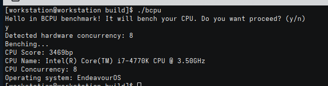 In example below it ran on EndeavourOS system with Intel Core i7-4770K CPU and it reached 3469 points.